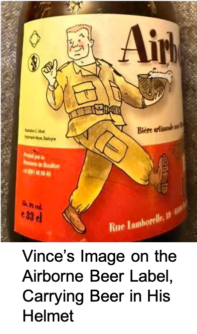 Airborne beer is brewed by the Bouillon brewery from a recipe from Brasserie Lamborelle. It comes in Brown and Blonde versions and is usually served in a ceramic mug in the shape of an army helmet. After returning from the Bruz beer tour that visited Bastogne, my good friends Barb and Steve brought me a bottle of Airborne beer and one of the helmet mugs. They told me the story of Vince Speranza and I thought it was too good not to share with you. Never underestimate the power of Belgian beer!